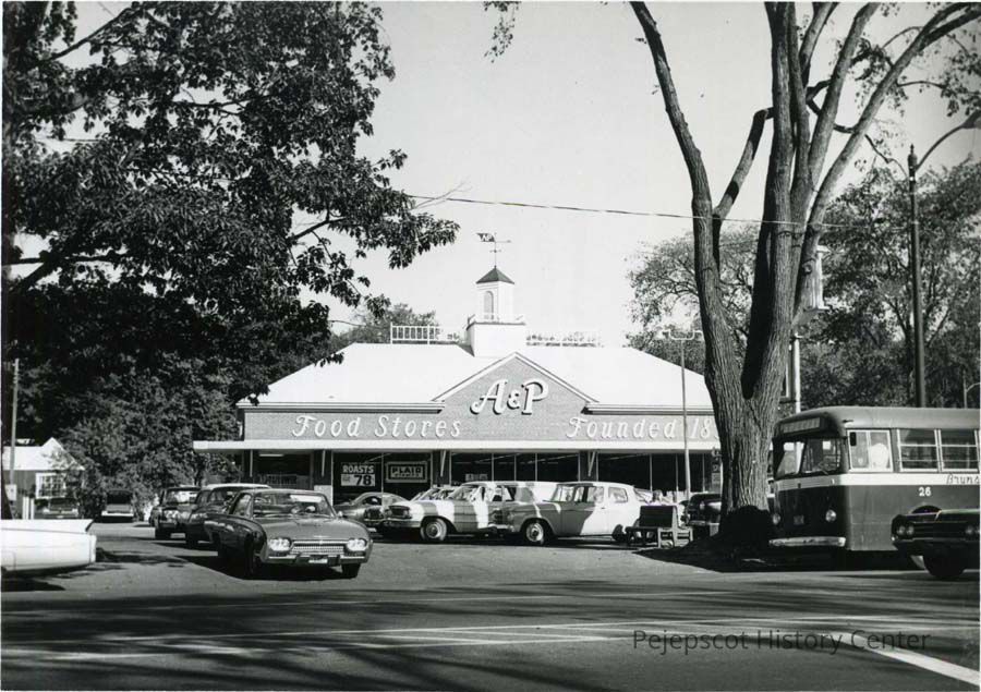 A B/W photograph of 135 Maine St., showing the A & P Food Store. c. 1967
