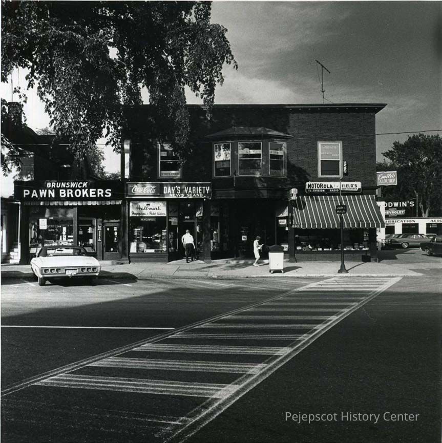 A photo of #143 Maine Street, showing Brunswick Pawn Brokers, Day's Variety, Fields Television and Radio, Ben's Barber Shop and Emilie's Tailor Shop.