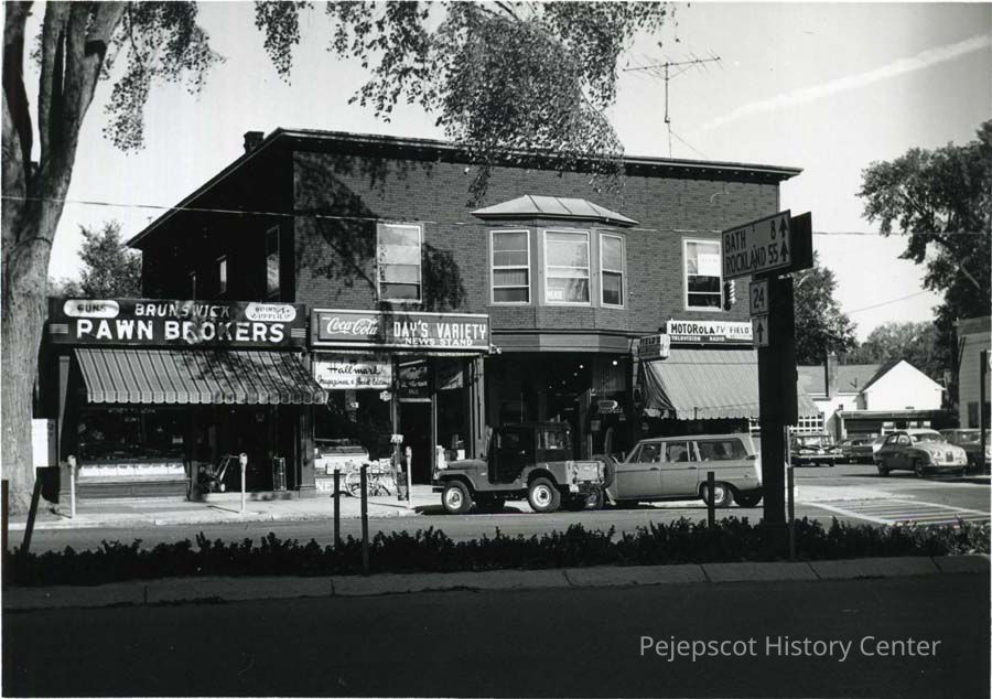 A photo of 147 Maine St., showing Brunswick Pawn Shop, Day's Variety and Fields Radio and Television. c. 1967