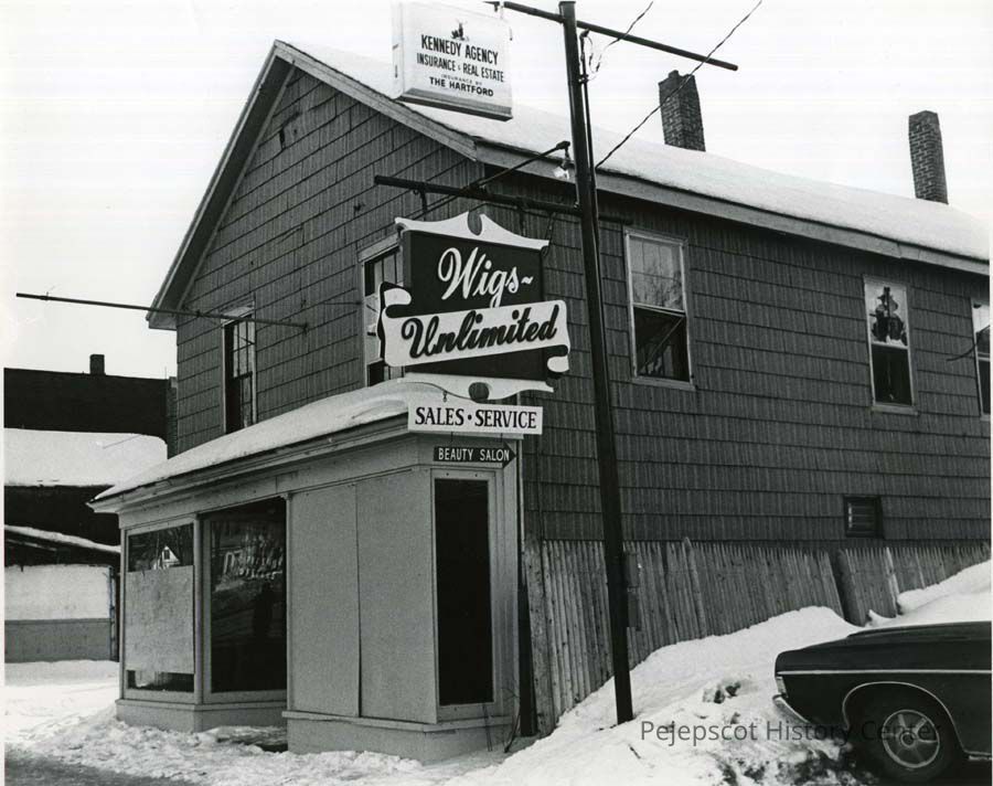 A B/W photograph of 172 Maine Street, showing Wig Unlimited and Kennedy Insurance Agency. c. 1970