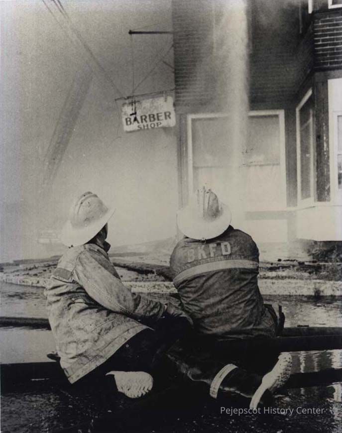 A B/W photograph of 2 Brunswick firefighters fighting a fire at a barbershop.