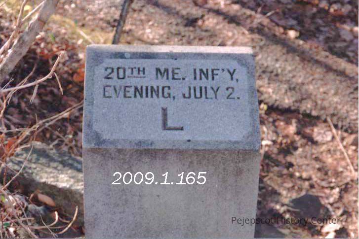 A color photograph of the 20th Maine Inf. left flank marker at Little Round Top, Gettysburg Pennsylvania.