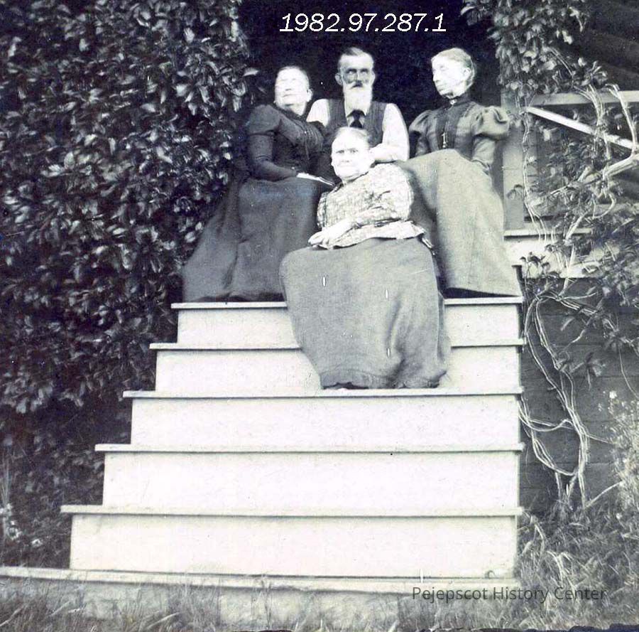 A B/W photograph of 4 people sitting on a door step. They are from left to right - Arabine Couillard, Uncle John Peterson, Abbie Ann Silsby, Aunt Abbie Peterson.Collection