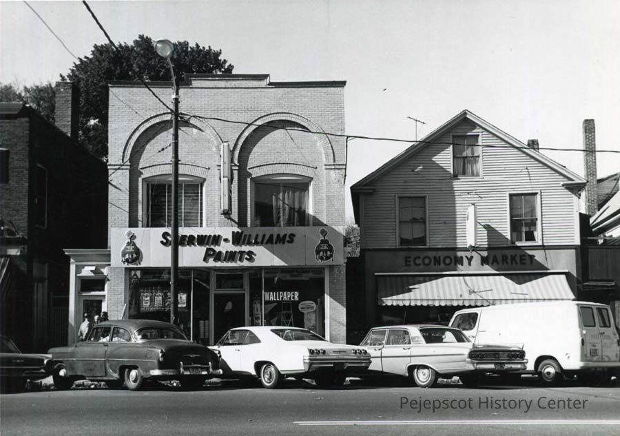 A photo of 44-46 Maine St., showing Sherwin Williams store and Economy Market. c. 1967.