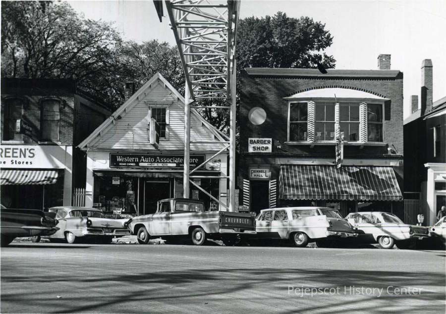 A B/W photograph of 54 Maine St., showing the Western Auto Associate Store, Pennel Hall and an unnamed barbershop.