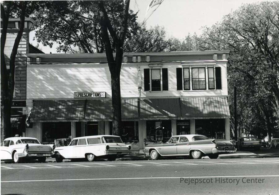 A photo of 60 Maine St., showing Drapeau's Pharmacy. c. 1967