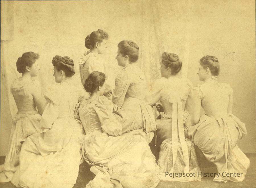 A B/W photograph of 7 women. They are sitting with their backs to the camera. Probably to show off their buns. They are all members of the Hedonic Club.