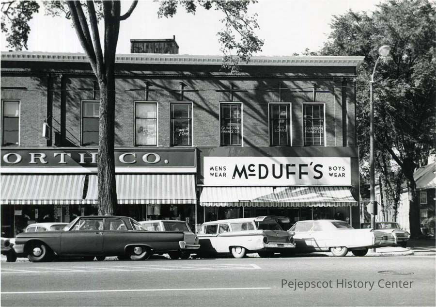 A photo of 90 Maine Street. McDuff's Clothing Co. and F. W. Woolworth Store can be seen. c. 1967.