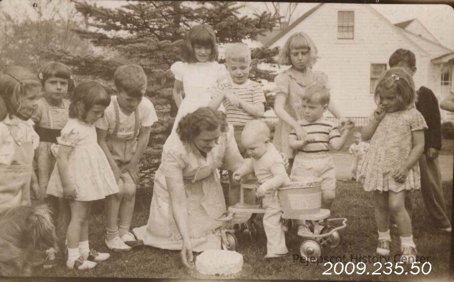 A B/W photograph of a child's birthday party. No one is identified.