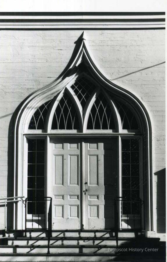A photo of a doorway of the Elijah Kellogg Church, Harpswell. c. 1992.
