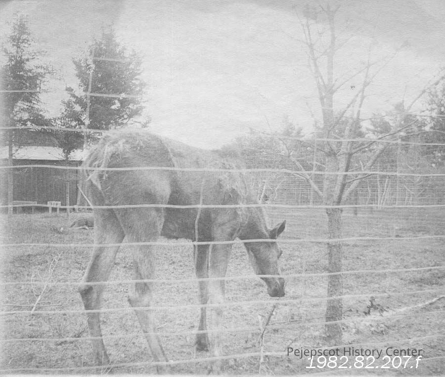 A B/W photograph of a female moose at Merrymeeting Park. The accession paper work calls it a colt.