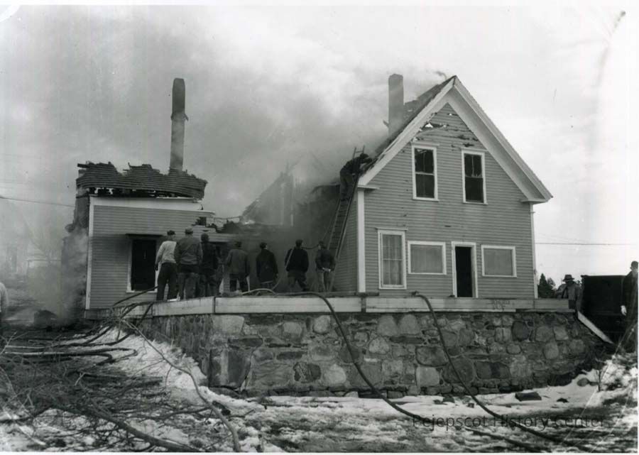 A B/W photograph of a fire that destroyed the home of William S. Skillings on Bailey Island. 3/23/1955