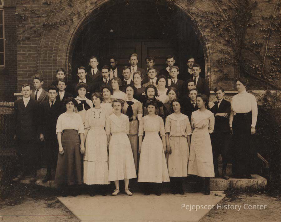 Brunswick High School Class of 1914, a B/W photo of a group of students in front of the old Brunswick High School on Federal Street. William A. Coffin is on the right end of the back row.