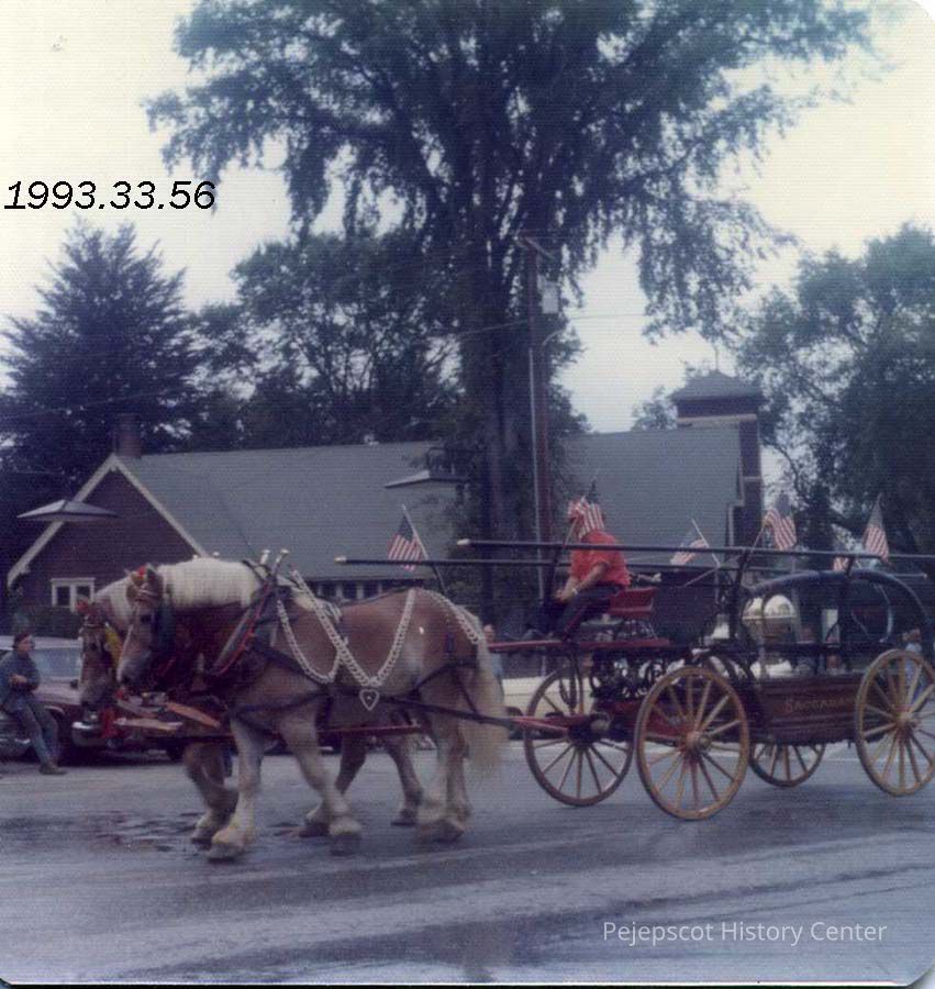 A color photograph of a horse drawn pumper in the Fireman's Convention Parade. 9/15/1973.