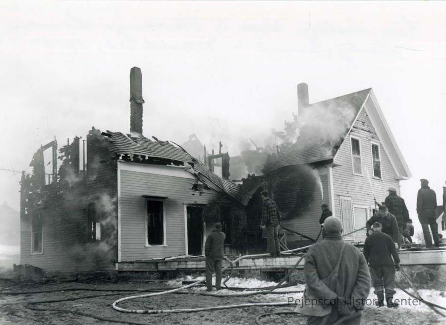 A B/W photograph of William S. Skilling's house on Bailey Island which was destroyed by fire. 3/23/1955