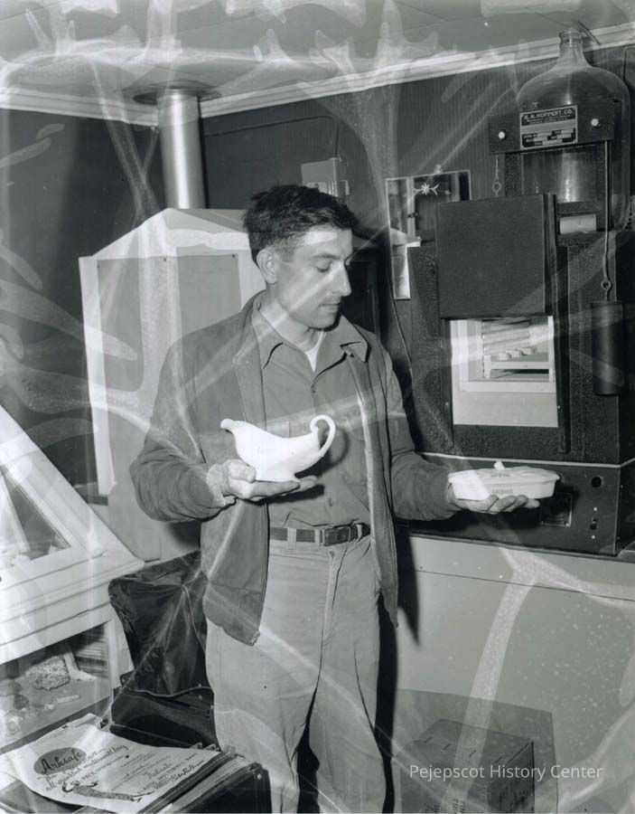 A photo of a man holding 2 dishes made from feldspar. The photo was taken at Emery Booker's feldspar mine in Topsham. 1955