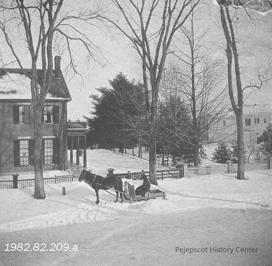A B/W photograph of a man in a horse drawn sleigh. It is a winter scene and the house at 71 Federal Street can be seen in the back ground.