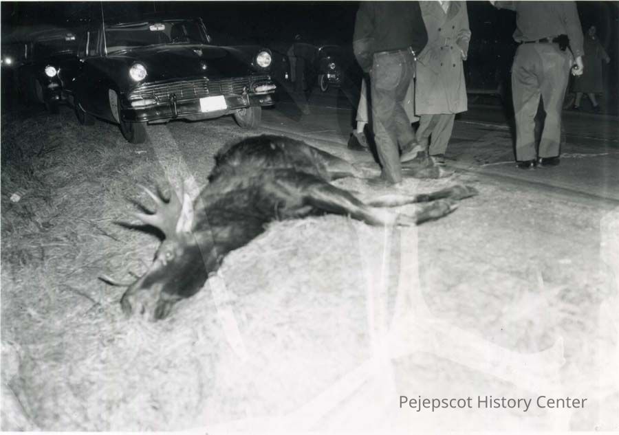 A photo of a moose killed by a car. 1/20/1955.