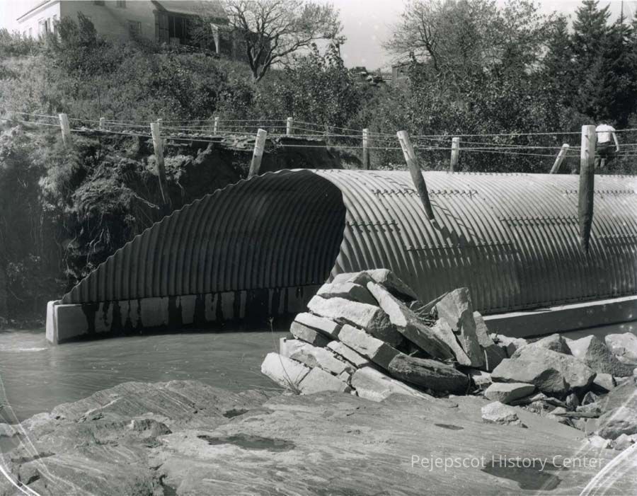 A B/W photograph of a big culvert washout at Bunganuc Creek.