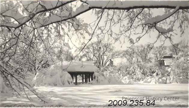 A B/W photograph of a winter scene behind the Curtis Library. 01/1944