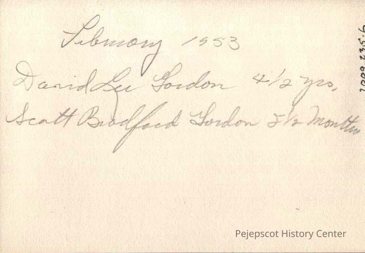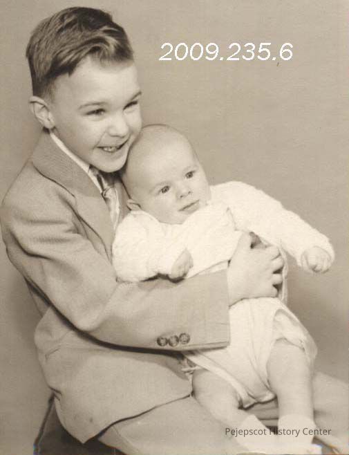 A B/W photograph of David Lee Gordon (4.1/2 years old) holding Scott Bradford Gordon (2.1/2 months old). 01/1953