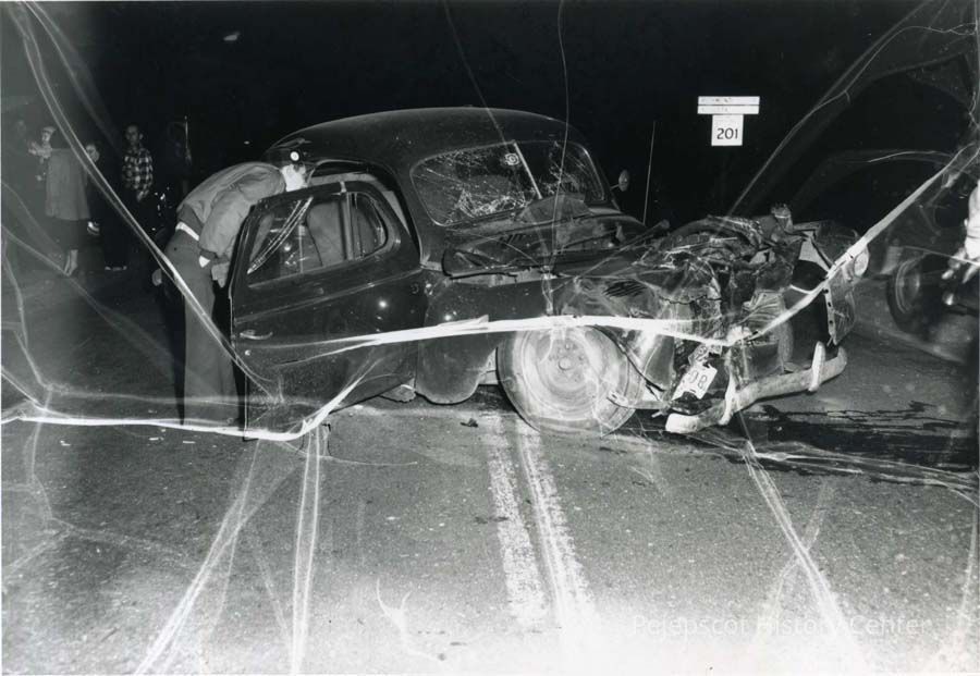 A B/W photograph of an accident at the intersection of routes 196 & 201 involving Donald P. Clark, sailor, and Henry Ellison.