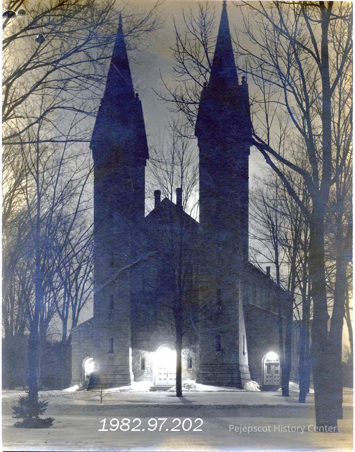 A B/W photograph of Bowdoin College's King Chapel at night in the winter.