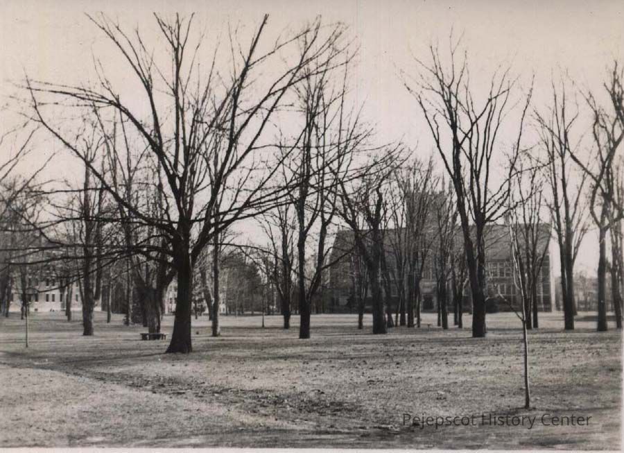A B/W photograph of Bowdoin College campus looking south.