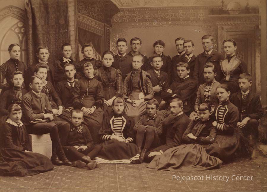 A B/W photograph of Brunswick Grammar School Class of 1890. They are left to right sitting on the floor, Affie Given (on box), Fred P. White, Mattie Loving, Nellie Merriman, Frances Harwood, Edward Wheeler, Edna Chandler and Ada Forsaith.