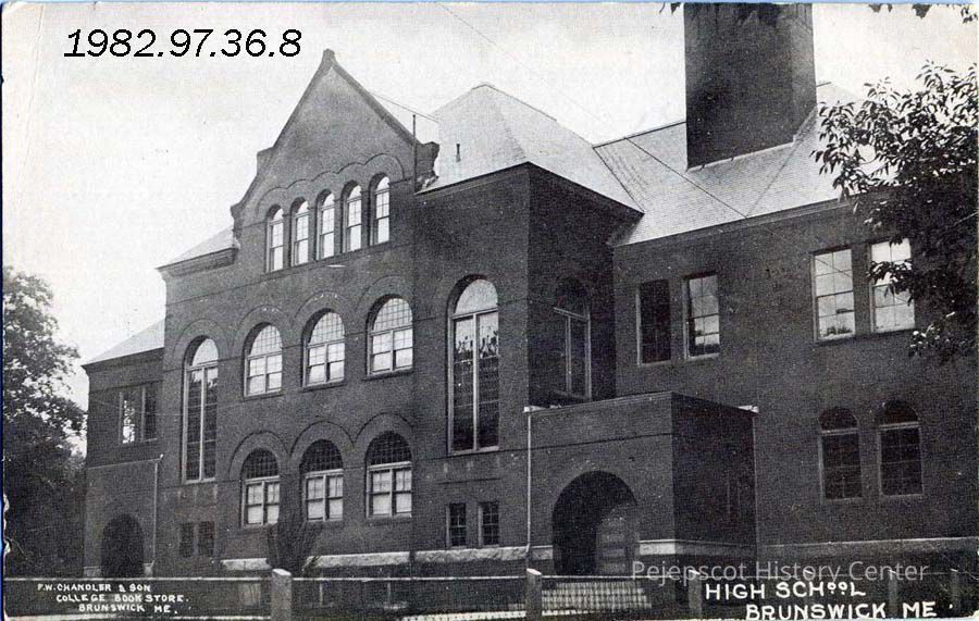 A B/W photograph of Old Brunswick High School before the fire. It stood on Federal Street.Collection
