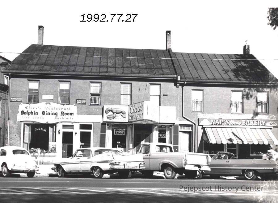 A B/W photograph of Clare's Restaurant and Nap's Home Bakery on Maine Street. Ca 1967.