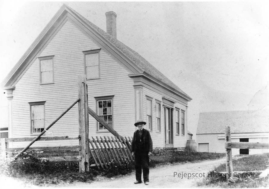A black and white photo of Deacon William Coffin in front of his home in Cundy's Harbor.