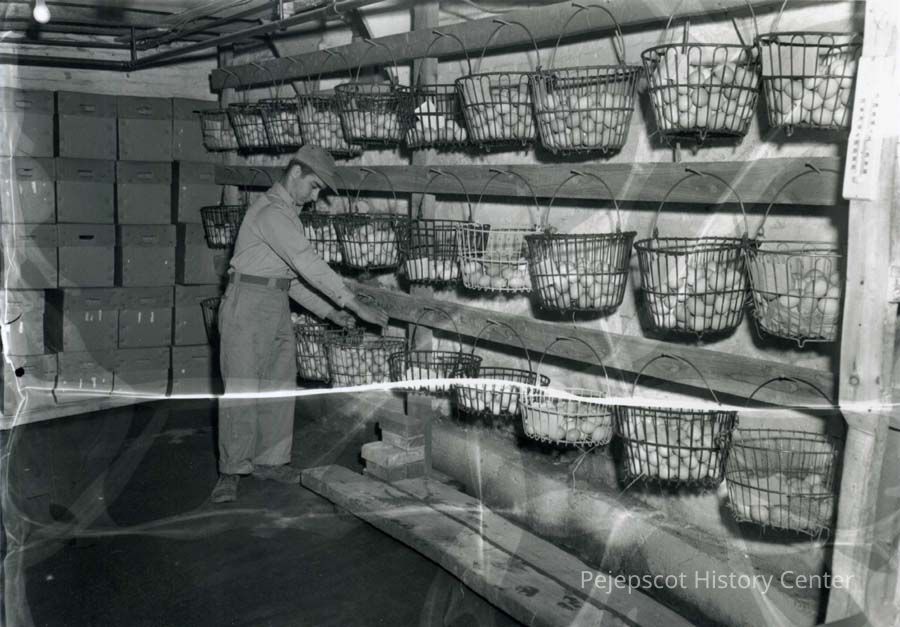 A B/W photograph of eggs at Coleman Farms. Jerry Pringer, circa 1950 There are 300 eggs per box (left in picture). Eggs sent to Decosta Egg Farm in Turner. Coleman Farm was involved in breeding and in egg production.