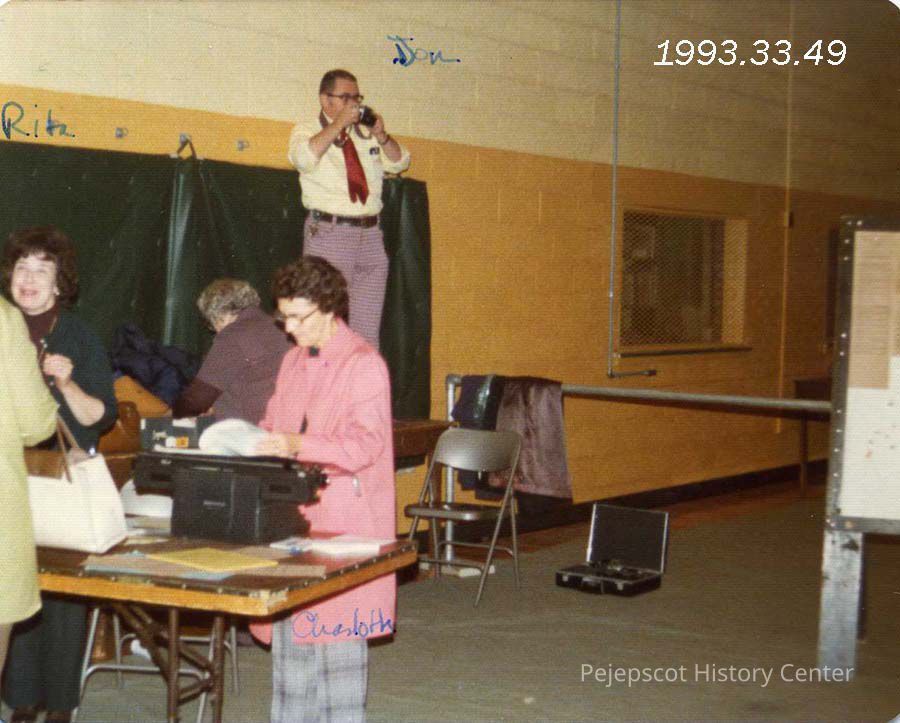 A color photograph of election night at Rec. Center, 3 am, Nov. 1974. The people are Rita Moffett, Don ? and Charlotte Guptil.
