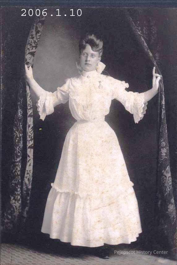 A B/W photograph of Eva Tibbetts. She is standing and wearing a white dress. She has a large white bow in her hair and is wearing glasses. The photo is mounted on a dark colored paper board.
