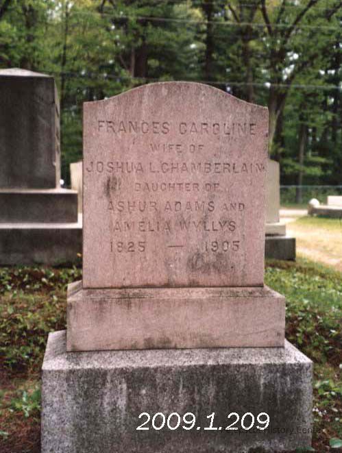 A color photograph of Francis Caroline's gravestone in the Chamberlain family plot at the Pine Grove Cemetery. She was JLC's wife and the daughter of Amelia Wyllys and Ashur Adams.