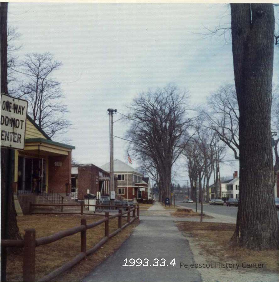 A color photograph looking down Federal Street from in front of the Recreation Center past the Municipal Building to Mason Street. 1973