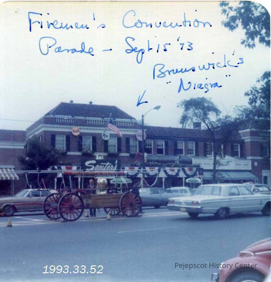 A color photograph of Fireman's Convention Parade with Brunswick's entry the "Niagara" in front of Senter's Store. 9/15/1973.