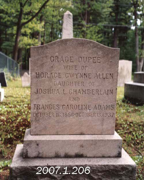 A color photograph of the back of Grace Dupee Chamberlain Allen's gravestone in the Chamberlain family plot at the Pine Grove Cemetery. Grace was the daughter of Frances A. and Joshua L Chamberlain and wife of Horace Gwynne Allen.