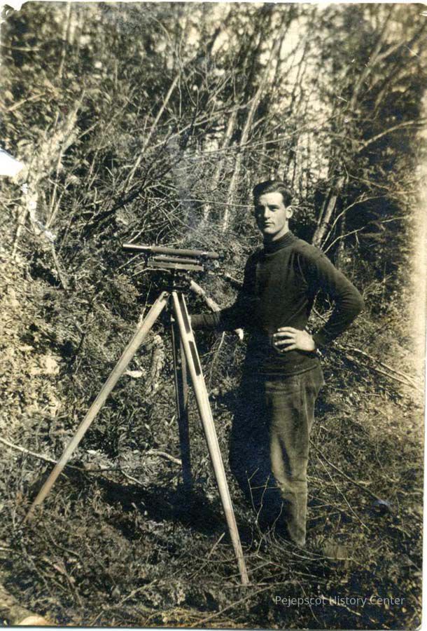 A B/W photograph of Herbert N. Skolfield with some surveyor's equipment.