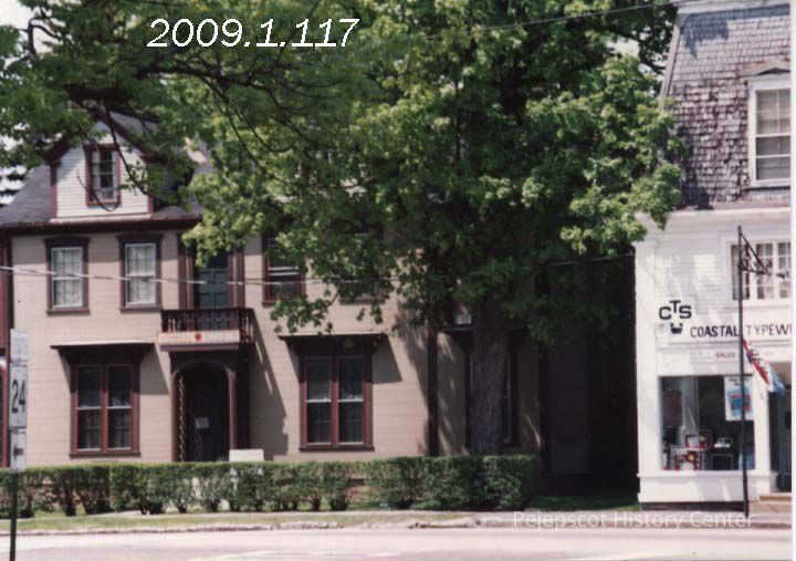 A color photograph of the JL Chamberlain House showing the adjacent store fronts which were torn down in 2005. 08/24/1989