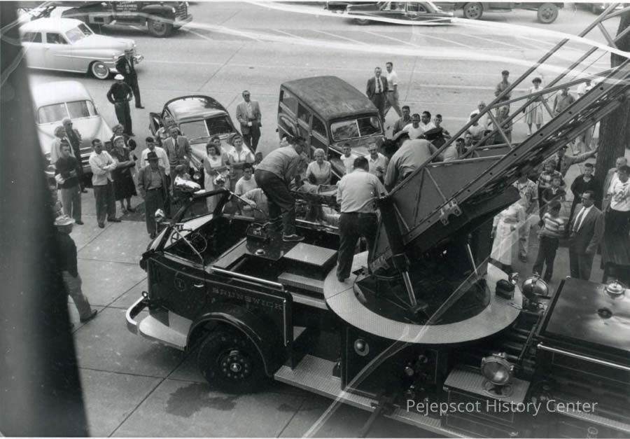 A B/W photograph of Stone Mason, John Landry, who fell from the Old Brunswick Town Hall tower onto the roof. He was employed by Cornell Construction Co. He suffered broken foot and toes. Here he is being lowered down.