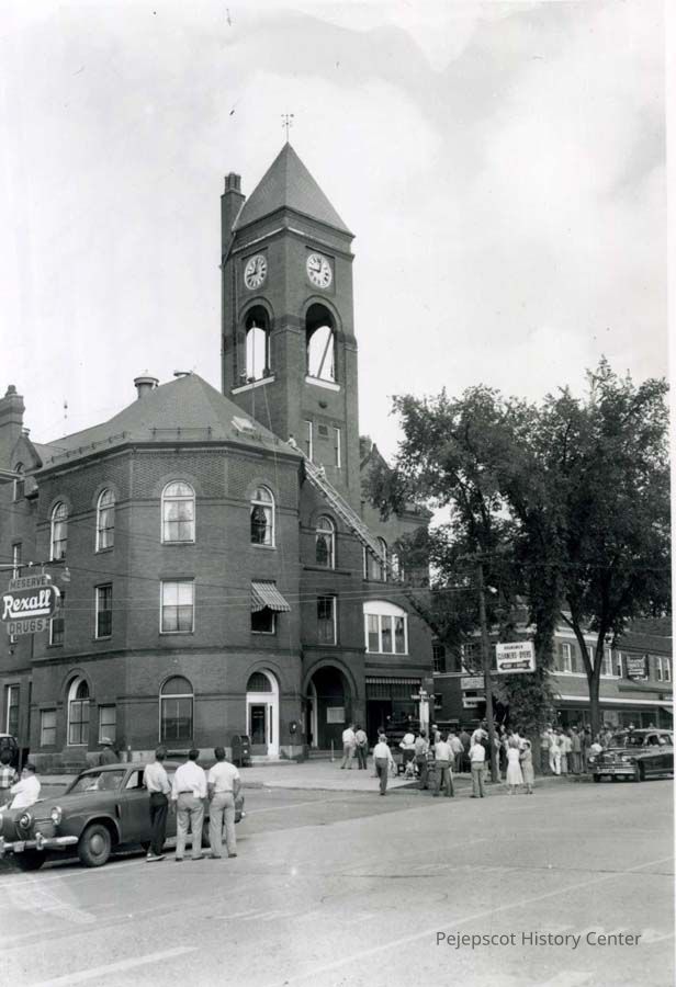 A B/W photograph of Stone Mason, John Landry, who fell from the Old Brunswick Town Hall tower onto the roof. He was employed by Cornell Construction Co. He suffered broken foot and toes. Here he is being rescued.