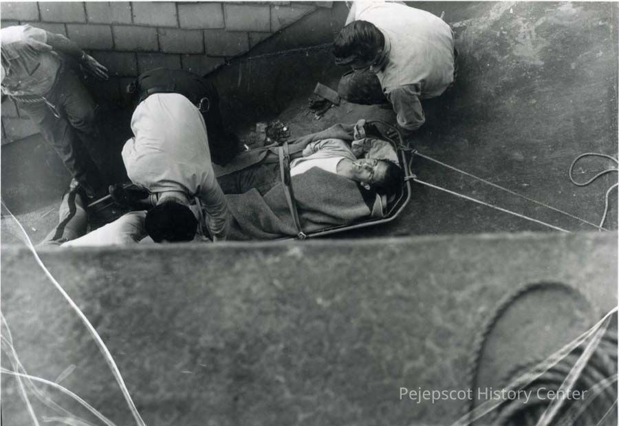 A B/W photograph of Stone Mason, John Landry, who fell from the Old Brunswick Town Hall tower onto the roof. He was employed by Cornell Construction Co. He suffered broken foot and toes.