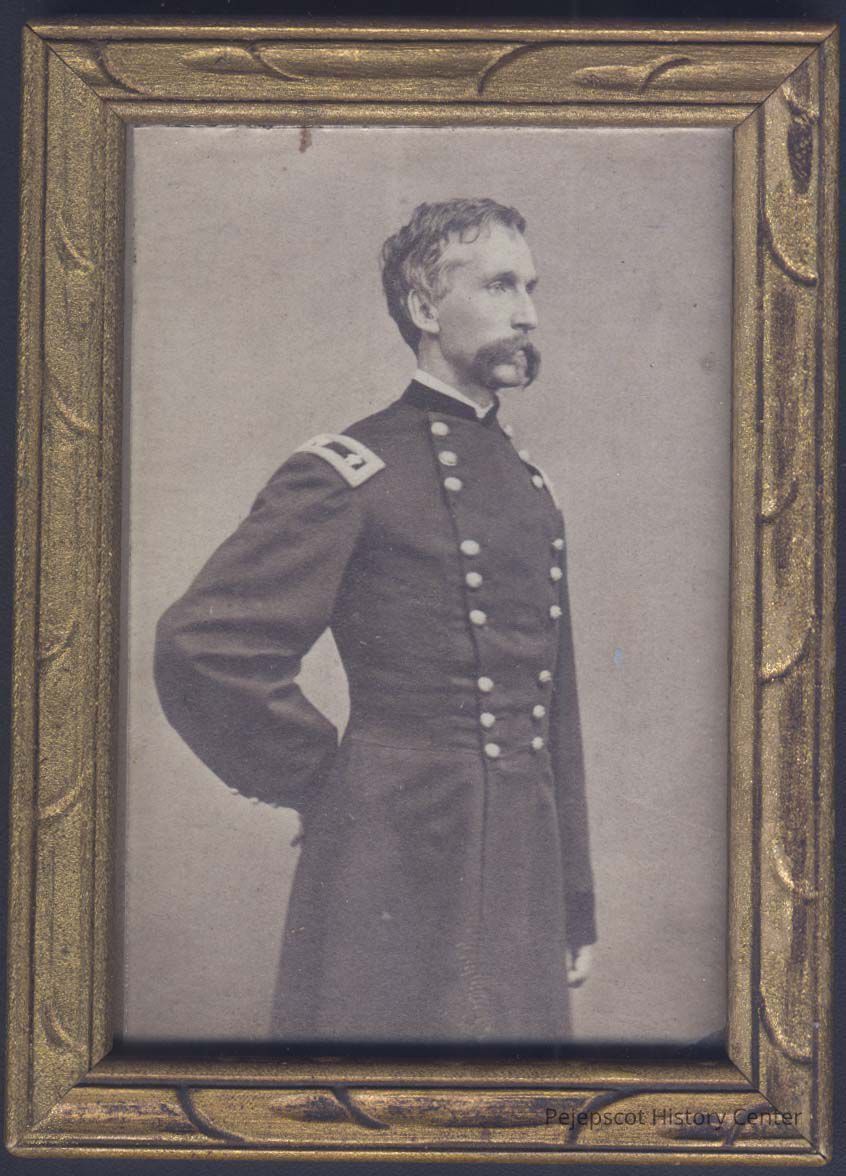 A B/W 3/4 standing photo of Joshua L. Chamberlain in major general's uniform.