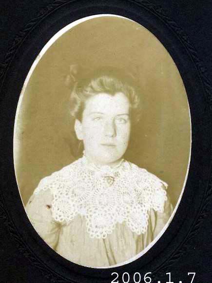 A B/W oval photograph of Lela Tibbetts. She is shown from the shouldiers up. She is wearing dark dress with lace collar. The photo is mounted ona dark paper board.
