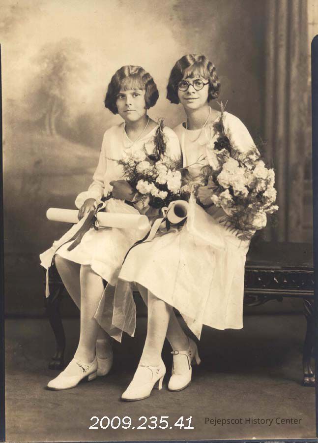 A B/W photograph of Leona and Evelyn St. Pierre holding high school diplomas and flowers..