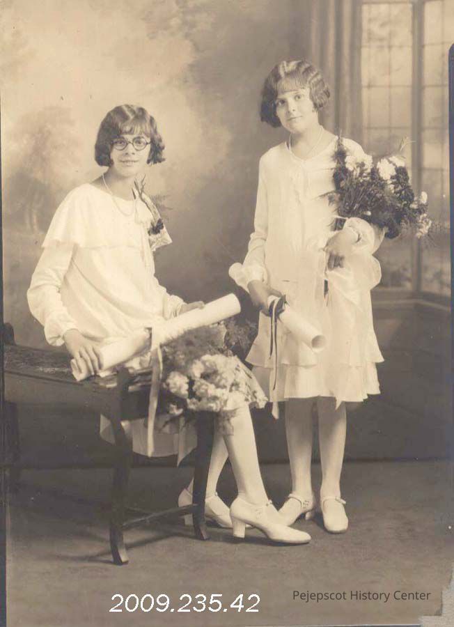 A B/W photograph of Leona and Evelyn St. Pierre holding flowers and high school diplomas..
