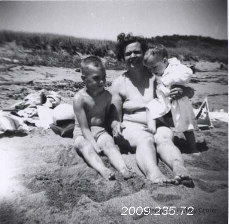 A B/W photograph of Leona Gordon and her two boys, David and Scott. They are sitting on a beach.