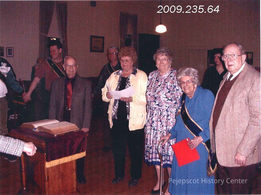A color photograph of Leona Gordon wearing a Grange sash. She is standing with a group of people. She is being recognized for being a member of the Grange for 70 years.Collection